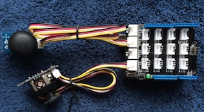 Adding A 2nd Joystick for Controlling Your BotSo you've got an omniwheeled bot, and you've been driving it a little bit. Perhaps you've noticed that your bot, though crab-like, rotates a little bit as well - particularly at slower speeds. Our controller math is good, but the bot's analog motors aren't all that precise; they need correction every once in a while. We are going to add a second joystick to our joystick Arduino, so we can rotate our bot clockwise or counter clockwise. If you've got a directional sensor (a camera?) or a directional light mounted on your bot, you can use the joystick to point your bot in any direction. The HardwareBuy a second Grove Thumb Joystick and Grove cable. Your first joystick's cable is plugged into your joystick Arduino's Base Shield A0 connector; plug your 2nd Thumb Joystick into the Base Shield's A2 connector. That's it for hardware setup.