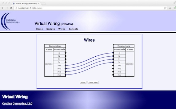 The Wires page is a web page in the Virtual Wiring system; it lets you add and remove wires. One gets to the Wires page by clicking on "Wires" at the top of any one of the Virtual Wiring system's web pages. The Wires page has two display modes. One is graphical and it's called the Punchblock view. The other is tabular and it's called the Table view. The Punchblock view is generally easier to work with as it provides a graphical display of Wires. The screen shots on this page illustrate the Punchblock view. Using the Punchblock view, Wires can be created and deleted with just a few mouse clicks. The display mode is controlled by clicking a button at the bottom of the Wires page. If one is looking at the Punchblock view, there is a button labeled "Table View" at the bottom of the page. If one is looking at the Table view, there is a button labeled "Punchblock View". Clicking one of these buttons will toggle between the two views. Both the Punchblock view and the Table view provide the same functionality. In each display, one can see all the wires in the system and which terminals they connect. Additionally, each display mode provides a means for adding and deleting wires. The two views are described in more detail in the following 2 sections. Virtual Wiring SpecificsWires start at a device terminal and end at another device terminal. Any device terminal can be wired to any other device terminal (including wiring two output terminals together). If a device has a terminal, one can put a wire on it. Wiring terminals together causes any output value from any of the connected terminals to be seen by all the terminals which are wired to that terminal. Wires are transitive, meaning if A is wired to B, and B is wired to C, then A is also wired to C (through B). Wires are bidirectional. The same wire can transmit an output from terminal A to B or from terminal B to A. A set of wires that are connected together is called a "net". If there are two output terminals on the same net, the net will see the output values from both the terminals, in the order that the terminals generate their output. The output terminal which last generates its output will have its value persist on the net. Virtual Wires vs WiresWires, or Virtual Wires, are similar to real wires, as they connect devices together, are bidirectional, and are transitive. However, they have an important difference. Unlike real wires, there is no such thing as a short circuit. A real wire can connect real devices together whose connect points are incompatible, causing device failures or worse. There is no analogy in Virtual Wires. If two outputs are connected together using Virtual Wires, their outputs are serialized - they don't contend with one another. If a Virtual Wire connects an output to an incompatible input, the input will ignore the output or (more rarely) generate a software warning or error message. So unlike real wires, one won't see sparks at a Virtual Wire's connect points. Still, if a Virtual Wire connects to a device terminal which controls a real device with a real output which can contend with another device's real output, a real danger still exists, but it's not at the connect point of a Virtual Wire. Virtually Wiring DevicesMuch like real wires, Virtual Wires connect device terminals together. If one had a real switch and a real light, connecting a wire from the switch to the light would enable the switch to control the light. A Virtual Wire between a switch device and a light device would function identically. However, a Virtual Wire is not physical, it's a virtual wire. It doesn't exist outside of computer, and it can be created and deleted from a web page. |